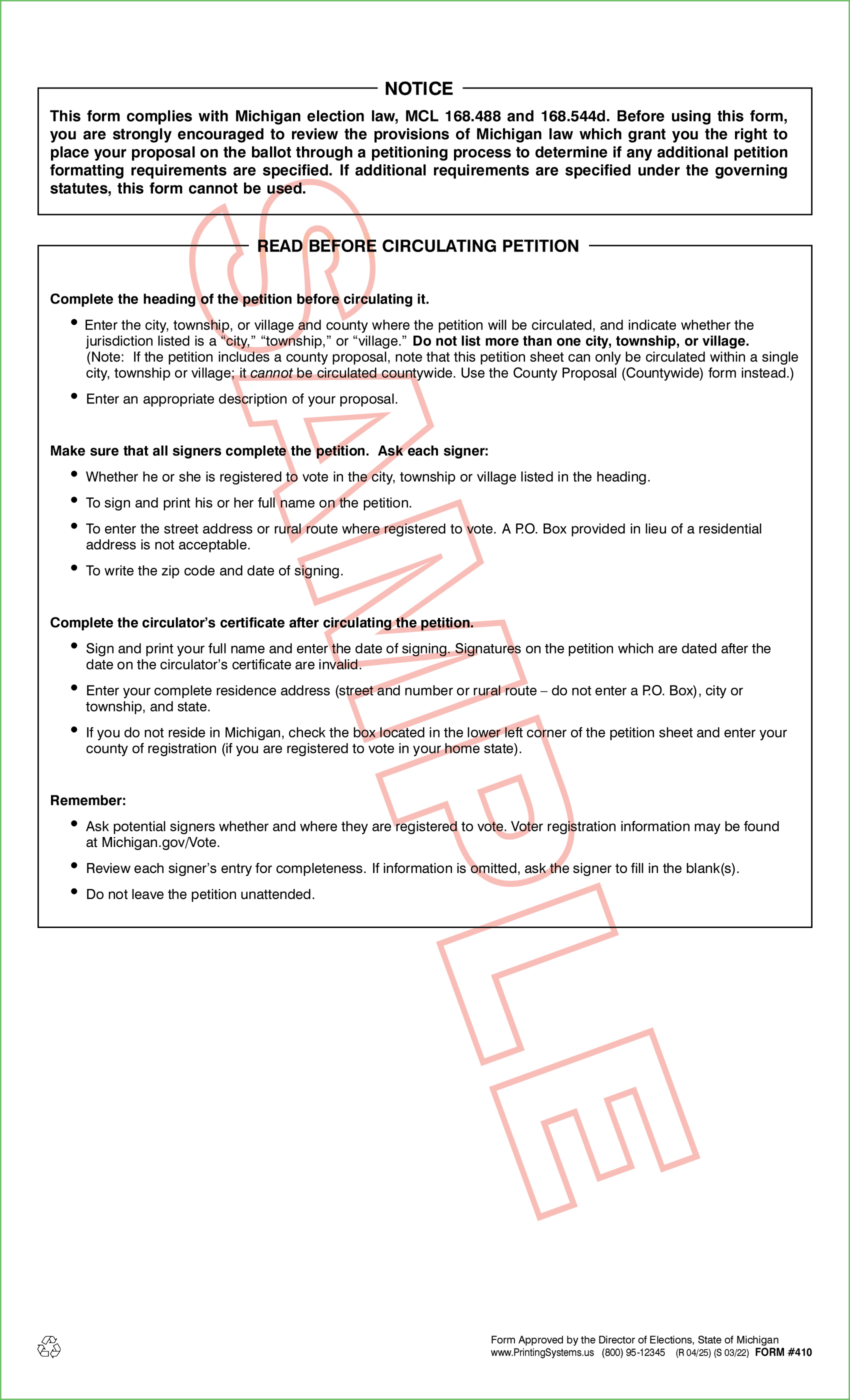 410 Local Proposal Petition (Ci/Twp/Village) (50 per pad) Rev. 4/25 (S 3/22)