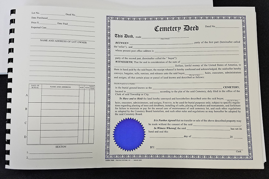 Some states require the heading to be "Cemetery Deed" or "Cemetery Lot Certificate". Please check your state laws to make sure you are using the correct verbiage. Michigan uses "Cemetery Lot Certificate".